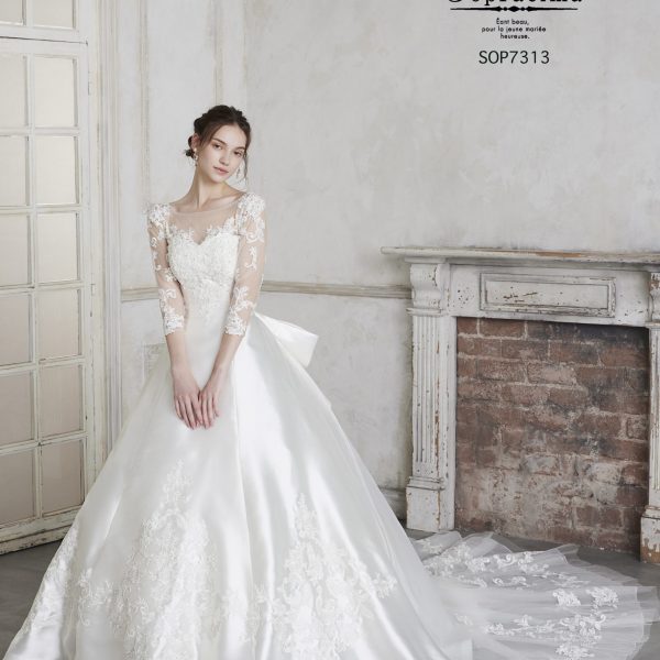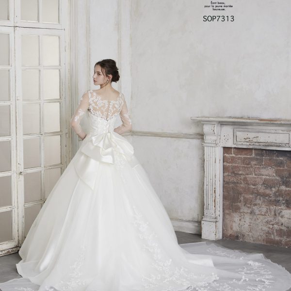 繊細なレース袖が気品を添える、後ろ姿も美しいクラシカルなAライン。