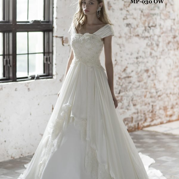 肩を優しく包むドレープが上品なAラインドレス。