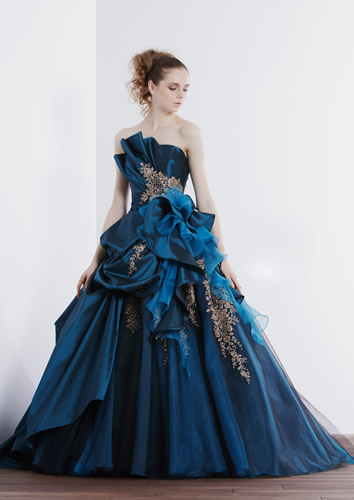深みあるブルーにゴールド刺繍が映える華やかプリンセスラインドレス。