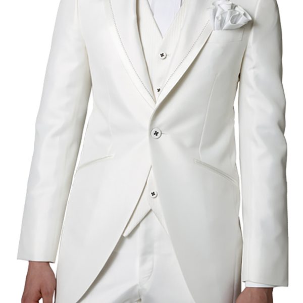 洗練された純白タキシードに黒蝶ネクタイが映える王道スタイル。