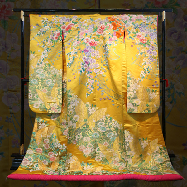 鮮やかな黄地に蝶と洋花が舞い、明るく可憐な装い。