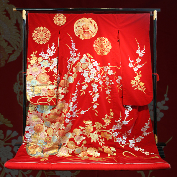 鮮やかな赤地に梅の花と金彩の華文が美しい。