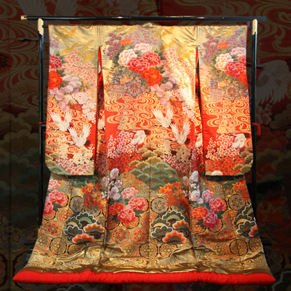 鶴と花車、水流模様が豪華に織り込まれた一着。
