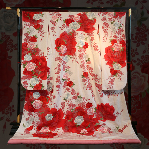 白地に赤い大輪のバラが映える。豪華なバラの花が情熱と愛を象徴する。