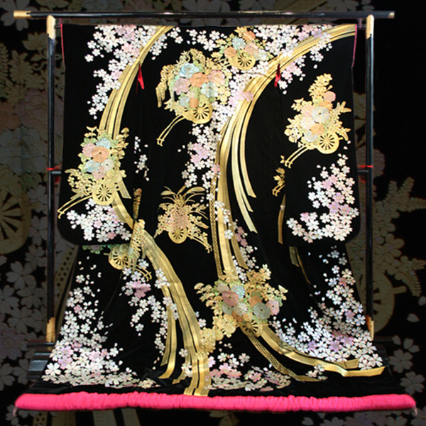 黒地に金の束熨柄と花車が豪華。優雅な花車と熨斗文様が織りなす伝統美。