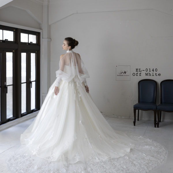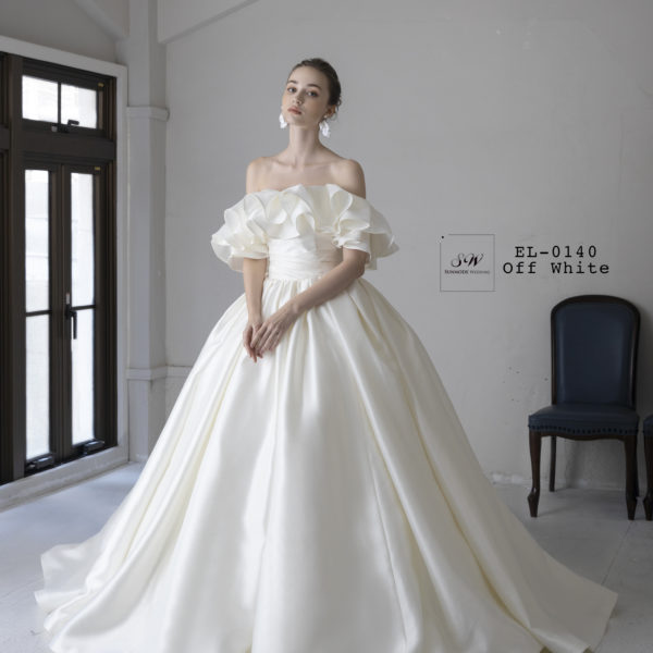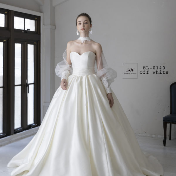 ウエディングドレス EL-0140 ハリのあるミカドサテンを使用した、シンプルな中にも上品さあふれるウェディングドレスです。 フリルでボリューム感あふれるヨークとシースルーの個性的な袖の2パターンが楽しめます。 NEXT